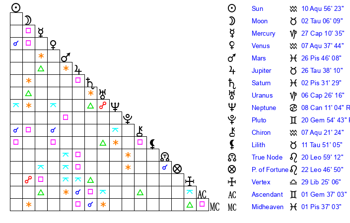 | Sun | 10 Aquarius 56 | 12 Aquarius 4 | 8 Gemini 21 |