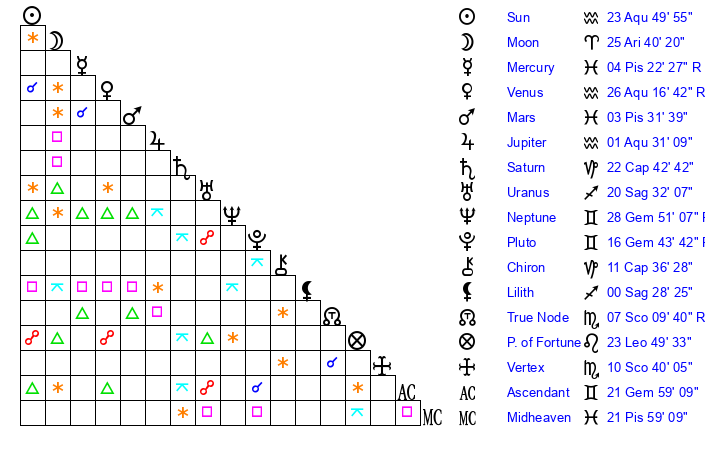 | Pluto | 16 Gemini 44 | 2 Aquarius 26 | 18 Gemini 20 |