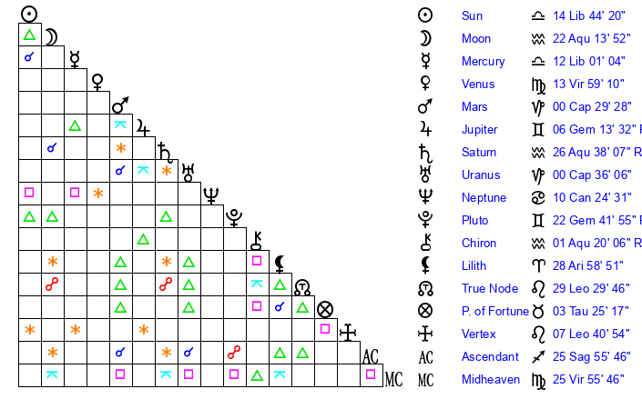 | Venus | 13 Virgo 59 | 23 Virgo 35 | 13 Aquarius 55 |
