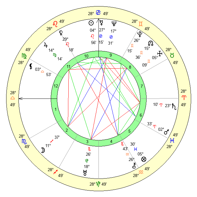 | Mercury | 27 Cancer 16 | 11 Leo 24 | 22 Scorpio 13 |