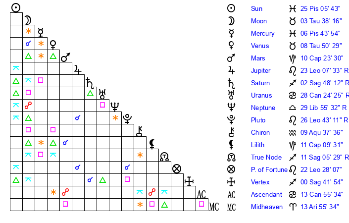 | Sun | 25 Pisces 5 | 25 Pisces 22 | 2 Gemini 30 |