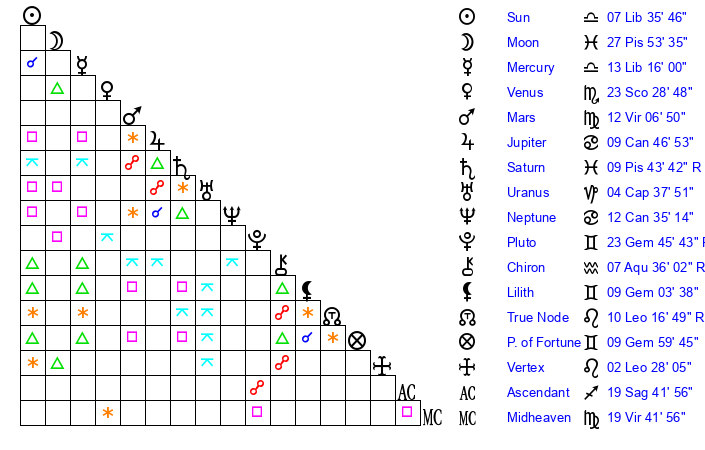 | Mars | 12 Virgo 7 | 6 Scorpio 21 | 25 Scorpio 30 |