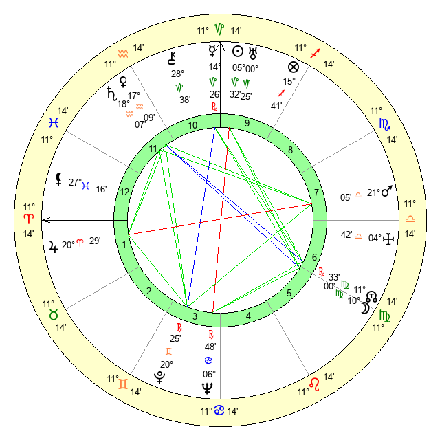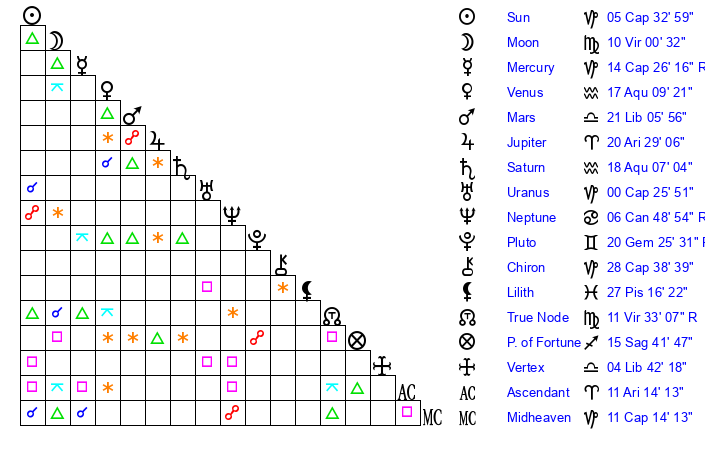 | Moon | 9 Virgo 51 | 5 Aries 7 | 20 Aquarius 50 |