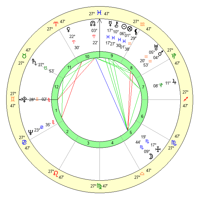 | Sun | 6 Pisces 30 | 7 Pisces 20 | 25 Gemini 51 |