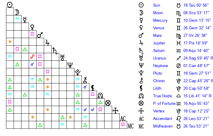 | Uranus | 24 Sagittarius 56 | 26 Taurus 53 | 21 Sagittarius 36 |