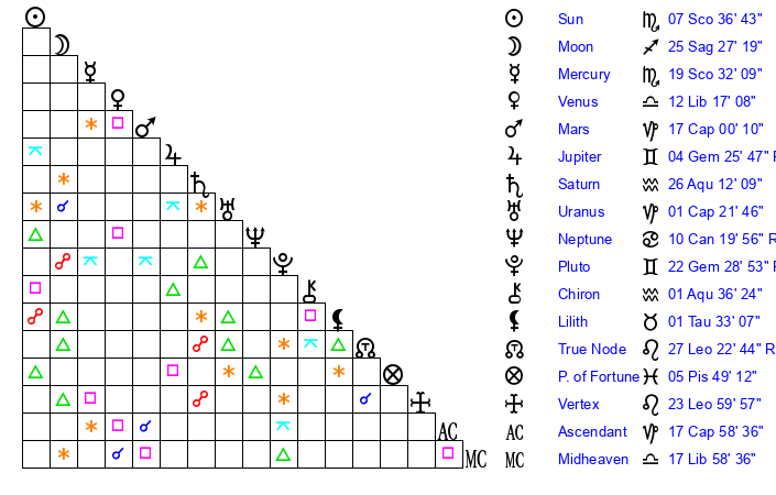 | Mars | 16 Capricorn 59 | 27 Scorpio 16 | 17 Aries 42 |