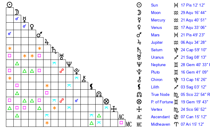 | Sun | 17 Pisces 12 | 18 Pisces 22 | 16 Cancer 31 |
