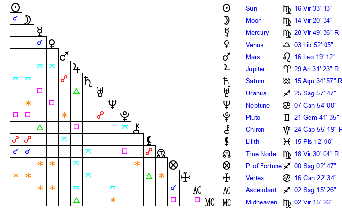 | Sun | 16 Virgo 33 | 17 Virgo 16 | 17 Capricorn 47 |