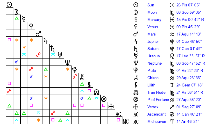 | Moon | 8 Scorpio 58 | 22 Libra 44 | 4 Aries 46 |