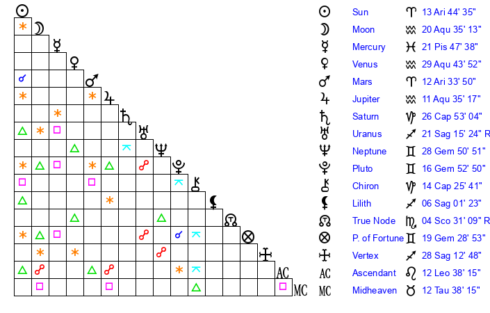 | Sun | 13 Aries 44 | 14 Aries 56 | 12 Leo 4 |