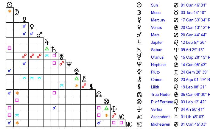 | Neptune | 14 Cancer 6 | 2 Aries 8 | 17 Cancer 7 |