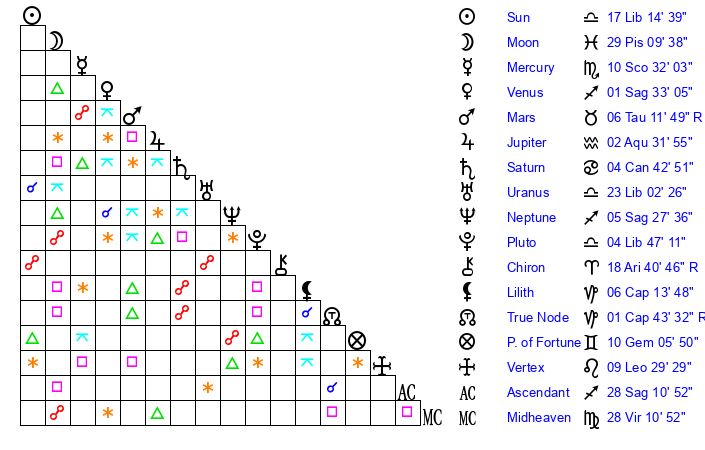 | Neptune | 5 Sagittarius 26 | 0 Aries 16 | 7 Sagittarius 14 |