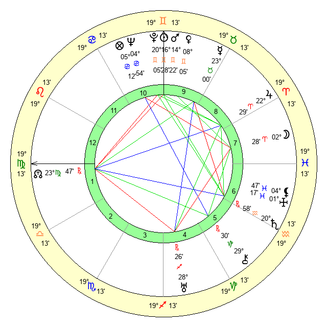 | Mars | 14 Gemini 22 | 24 Leo 40 | 3 Virgo 10 |