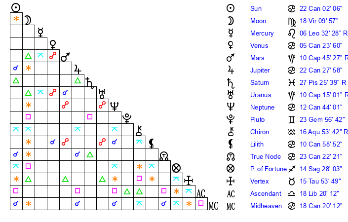 | Moon | 18 Virgo 10 | 23 Pisces 19 | 20 Capricorn 33 |