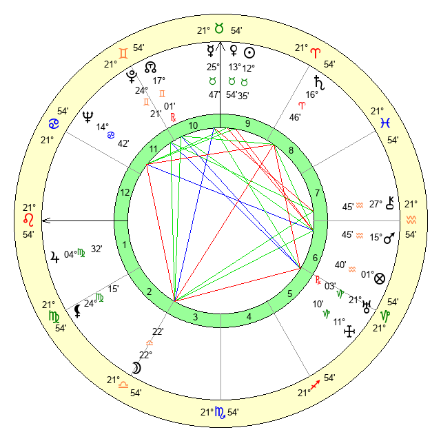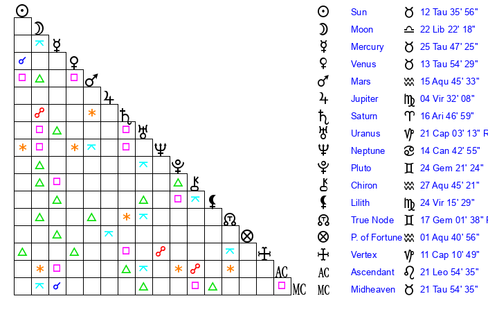 | Sun | 12 Taurus 36 | 13 Taurus 30 | 3 Virgo 45 |