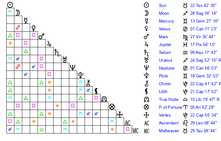 | Uranus | 24 Sagittarius 49 | 27 Taurus 7 | 21 Sagittarius 38 |