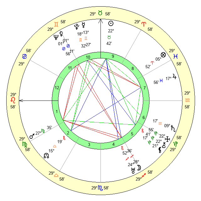 | Mars | 27 Virgo 34 | 12 Leo 9 | 23 Scorpio 58 |