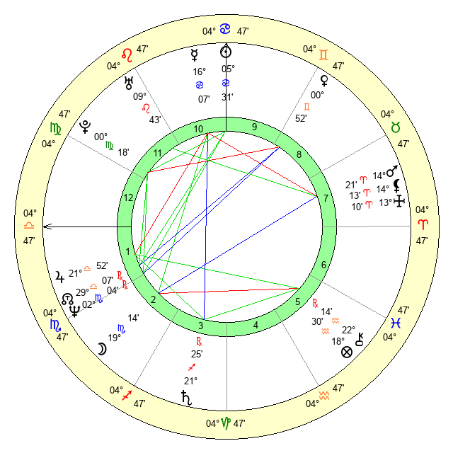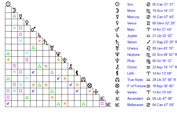 | Moon | 19 Scorpio 15 | 6 Leo 16 | 28 Aries 48 |
