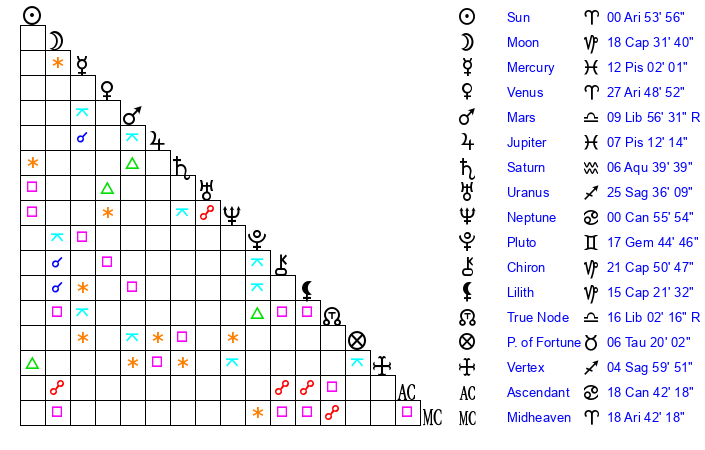 | Venus | 27 Aries 49 | 2 Aries 53 | 13 Virgo 30 |