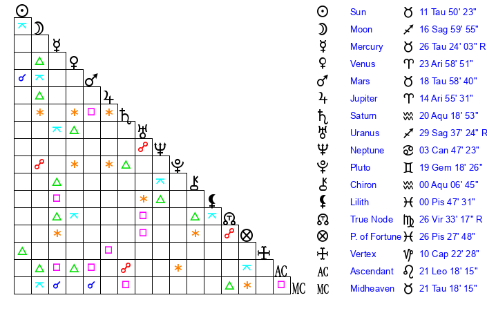 | Moon | 17 Sagittarius 1 | 19 Cancer 42 | 9 Taurus 40 |