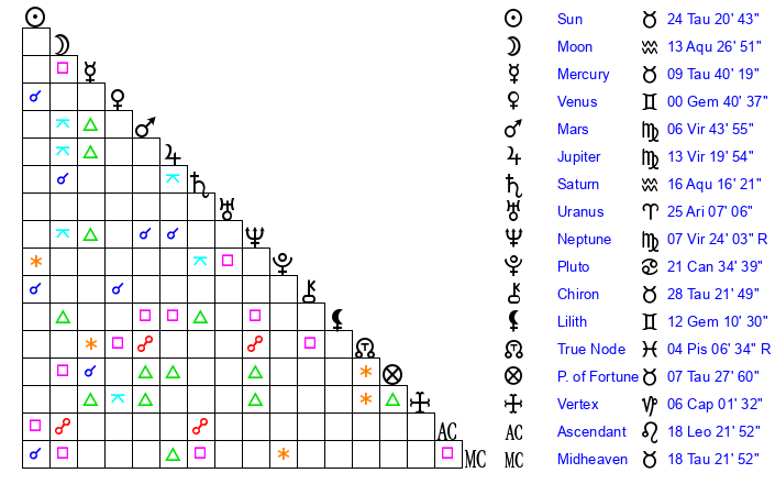 | Sun | 24 Taurus 21 | 25 Taurus 4 | 22 Leo 21 |