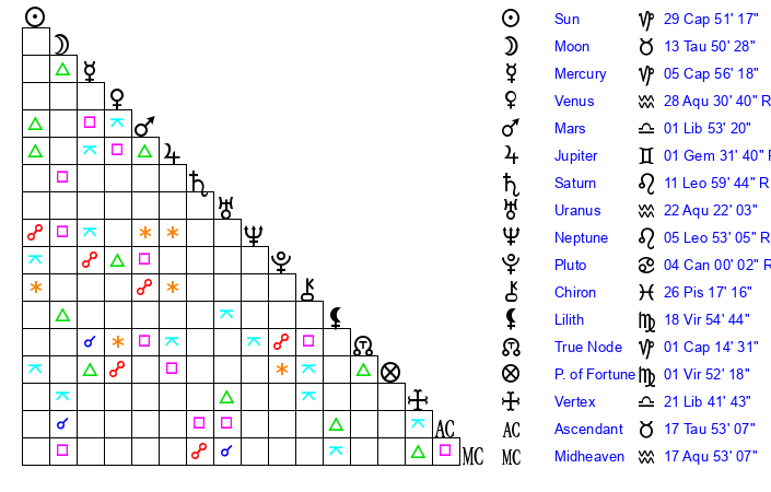 | Sun | 29 Capricorn 51 | 0 Aquarius 53 | 16 Taurus 18 |