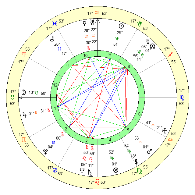 | Moon | 13 Taurus 52 | 18 Libra 25 | 7 Aries 3 |