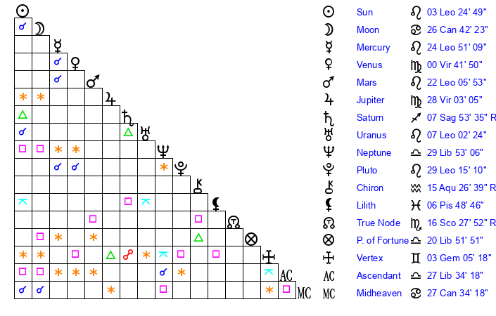 | Pluto | 29 Leo 14 | 2 Aquarius 32 | 1 Virgo 23 |