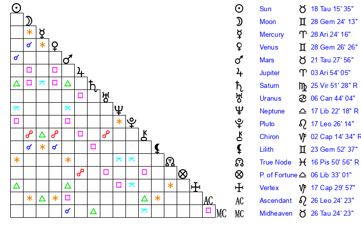| Saturn | 26 Virgo 25 | 28 Pisces 36 | 28 Virgo 26 |