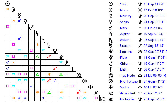 | Venus | 21 Capricorn 59 | 13 Capricorn 52 | 23 Gemini 2 |