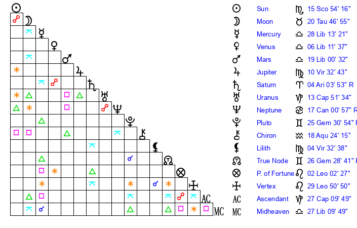 | Venus | 6 Libra 12 | 2 Scorpio 13 | 0 Pisces 46 |