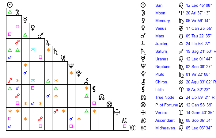 | Moon | 20 Aries 36 | 29 Sagittarius 56 | 1 Libra 22 |