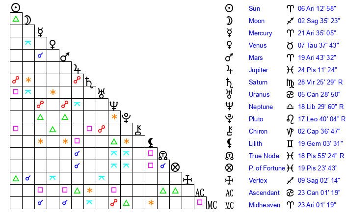 | Moon | 2 Sagittarius 33 | 12 Pisces 58 | 12 Leo 51 |