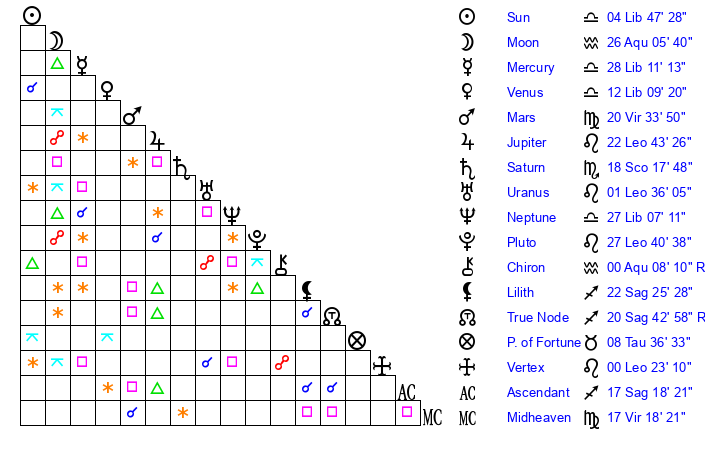 | Saturn | 18 Scorpio 45 | 27 Pisces 49 | 26 Scorpio 41 |