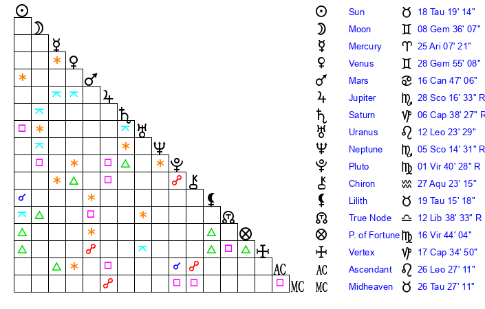 | Sun | 18 Taurus 19 | 19 Taurus 19 | 21 Cancer 30 |