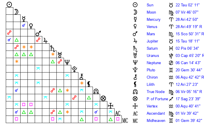 | Moon | 7 Virgo 52 | 1 Sagittarius 43 | 9 Aquarius 59 |