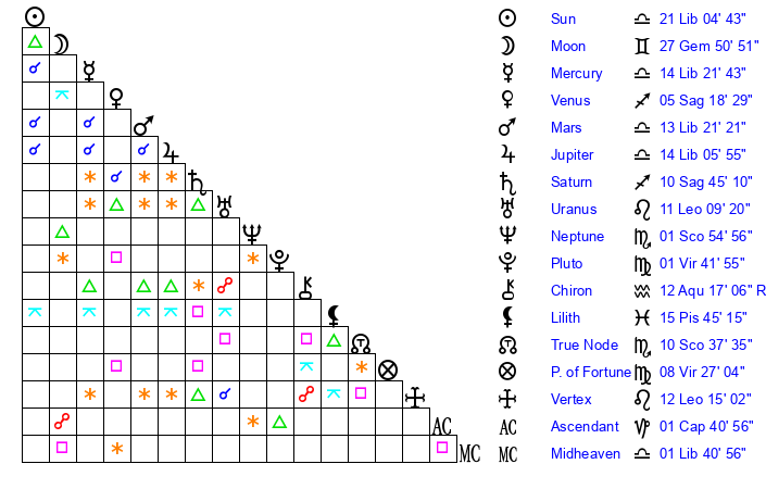| Jupiter | 13 Libra 59 | 23 Cancer 55 | 27 Libra 2 |