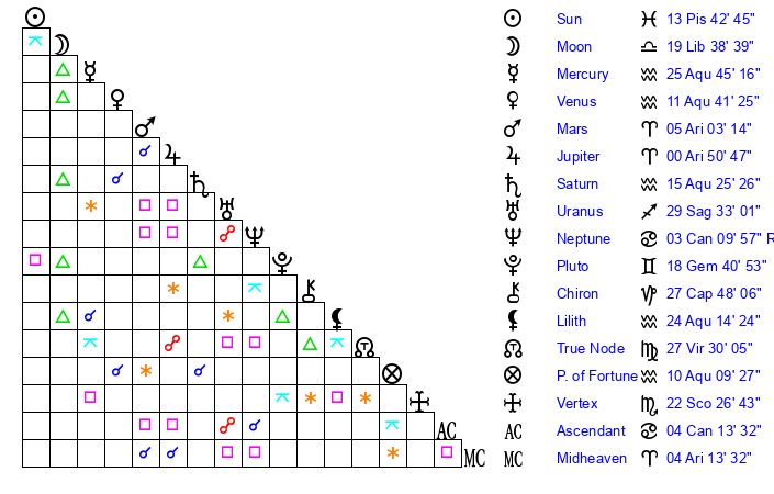 | Moon | 19 Libra 35 | 18 Taurus 21 | 16 Pisces 40 |