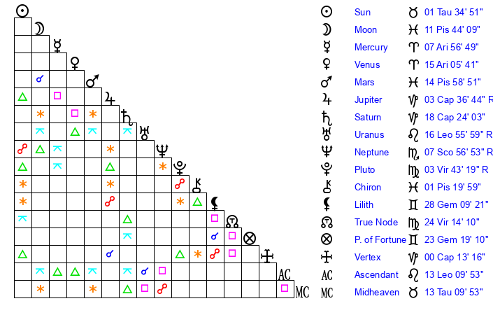 | Moon | 11 Pisces 40 | 9 Aquarius 29 | 21 Cancer 12 |