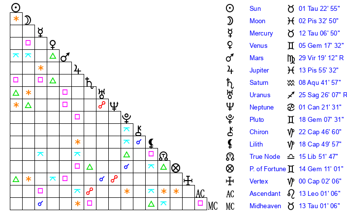 | Sun | 1 Taurus 23 | 2 Taurus 49 | 28 Leo 24 |