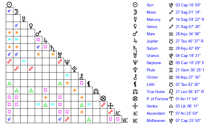 | Mars | 28 Aquarius 34 | 7 Capricorn 53 | 27 Taurus 13 |