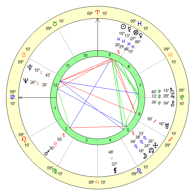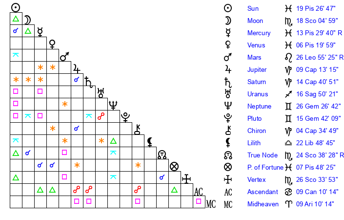 | Sun | 19 Pisces 26 | 20 Pisces 22 | 19 Cancer 36 |