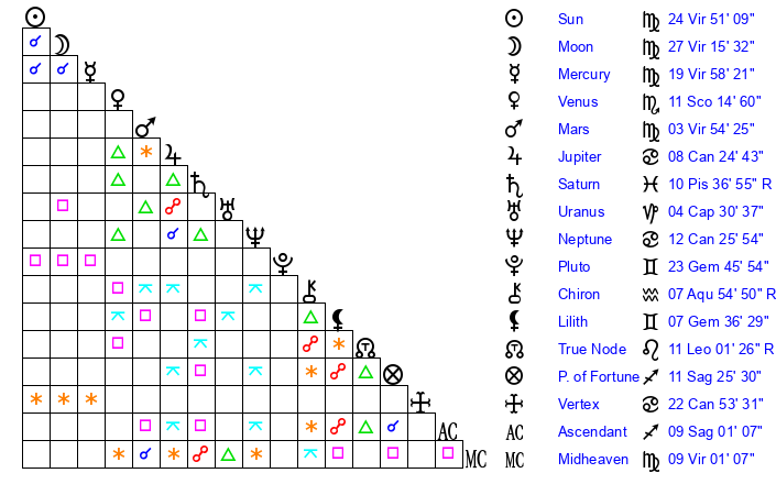 | Moon | 27 Virgo 16 | 19 Leo 25 | 14 Aquarius 29 |