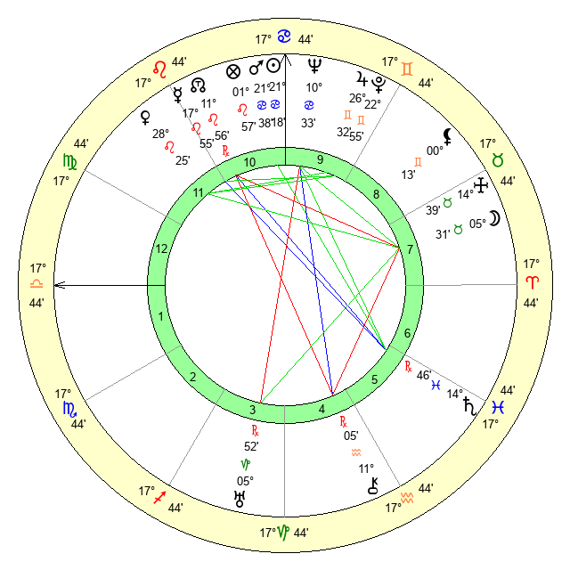 | Moon | 5 Taurus 34 | 9 Pisces 42 | 2 Virgo 32 |