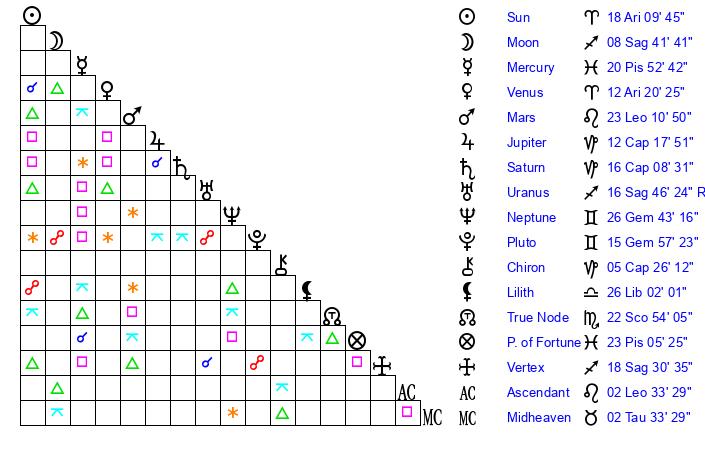 | Sun | 18 Aries 9 | 19 Aries 6 | 17 Leo 20 |