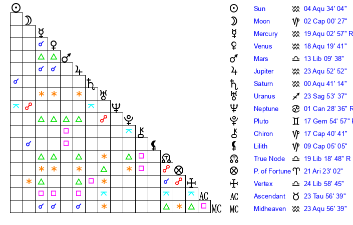| Sun | 4 Aquarius 34 | 5 Aquarius 59 | 5 Gemini 12 |