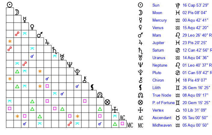| Venus | 15 Aquarius 42 | 5 Pisces 36 | 21 Gemini 26 |