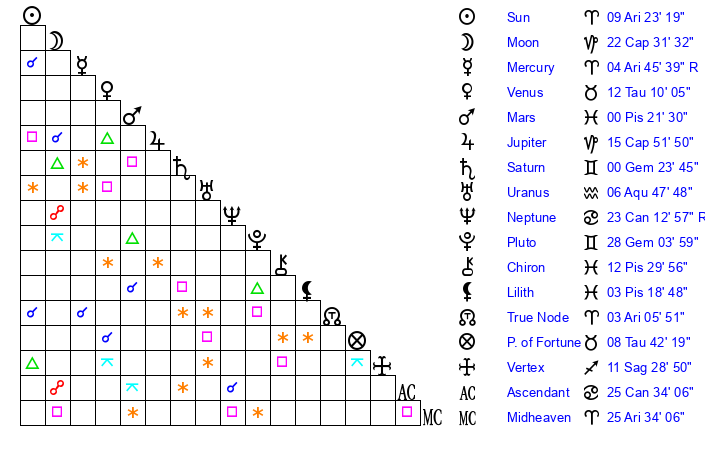 | Moon | 22 Capricorn 31 | 27 Aries 55 | 24 Aquarius 52 |