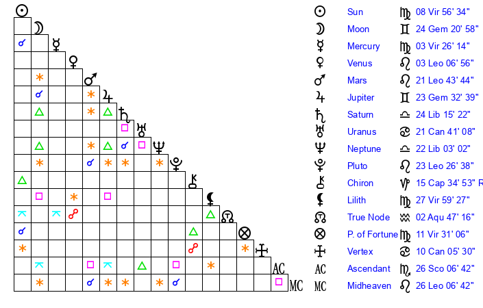 | Venus | 3 Leo 7 | 8 Leo 24 | 1 Scorpio 11 |