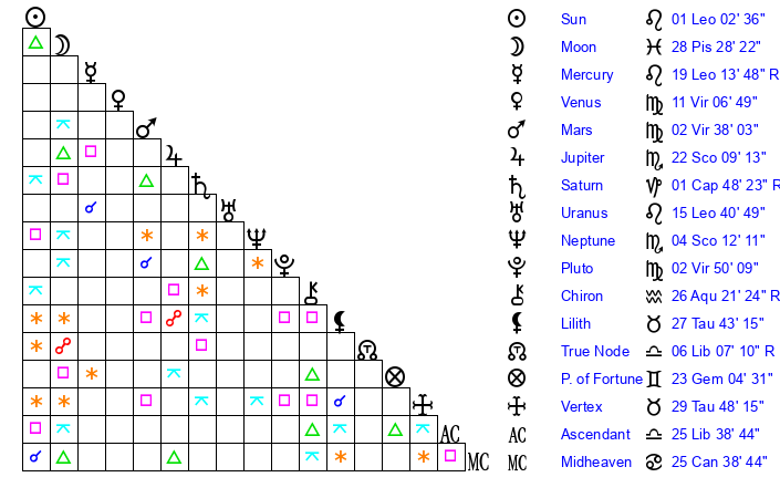 | Moon | 28 Pisces 31 | 0 Leo 46 | 16 Leo 8 |